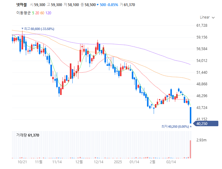 넷마블의 현재 주가는 40,250원입니다. 전일 대비 -4,100원 이동한 모습입니다. 시가 총액은 3조4596억 원이며 발행 주식은 총 85,953,502주 입니다. 외국인이 보유한 비중은 25.60%입니다. 넷마블 기업의 영업이익은 억 원을 달성했으며 배당 수익율은 % 입니다.