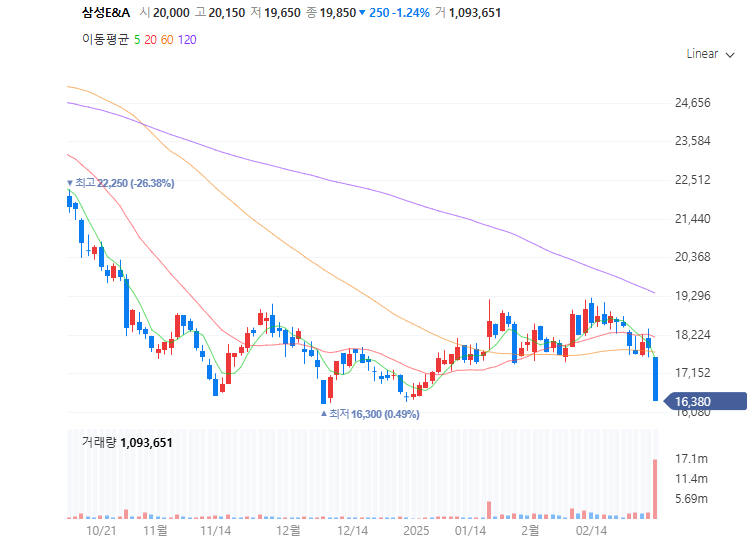 삼성E&A의 현재 주가는 16,380원입니다. 전일 대비 -1,470원 이동한 모습입니다. 시가 총액은 3조 2105억 원이며 발행 주식은 총 196,000,000주입니다. 외국인이 보유한 비중은 42.52%입니다. 삼성E&A 기업의 영업이익은 억 원을 달성했으며 배당 수익률은 %입니다.