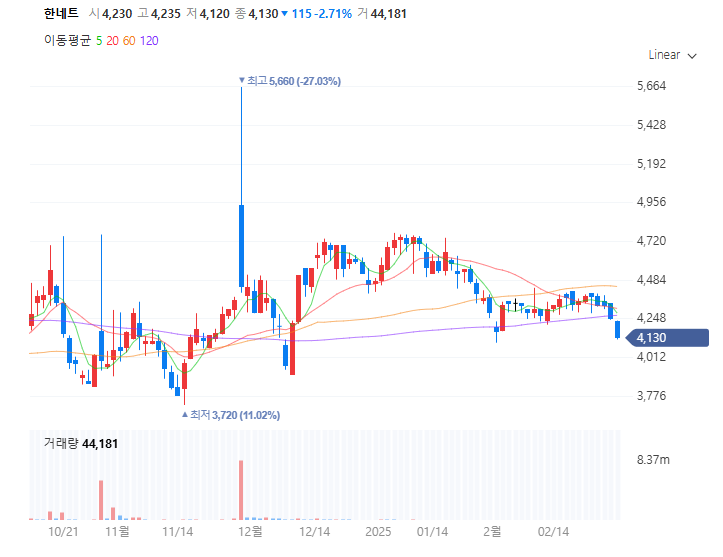 한네트의 현재 주가는 4,130원입니다. 전일 대비 -115원 이동한 모습입니다. 시가 총액은 478억 원이며 발행 주식은 총 11,563,700주입니다. 외국인이 보유한 비중은 3.58%입니다. 한네트 기업의 영업이익은 억 원을 달성했으며 배당 수익률은 25%입니다.